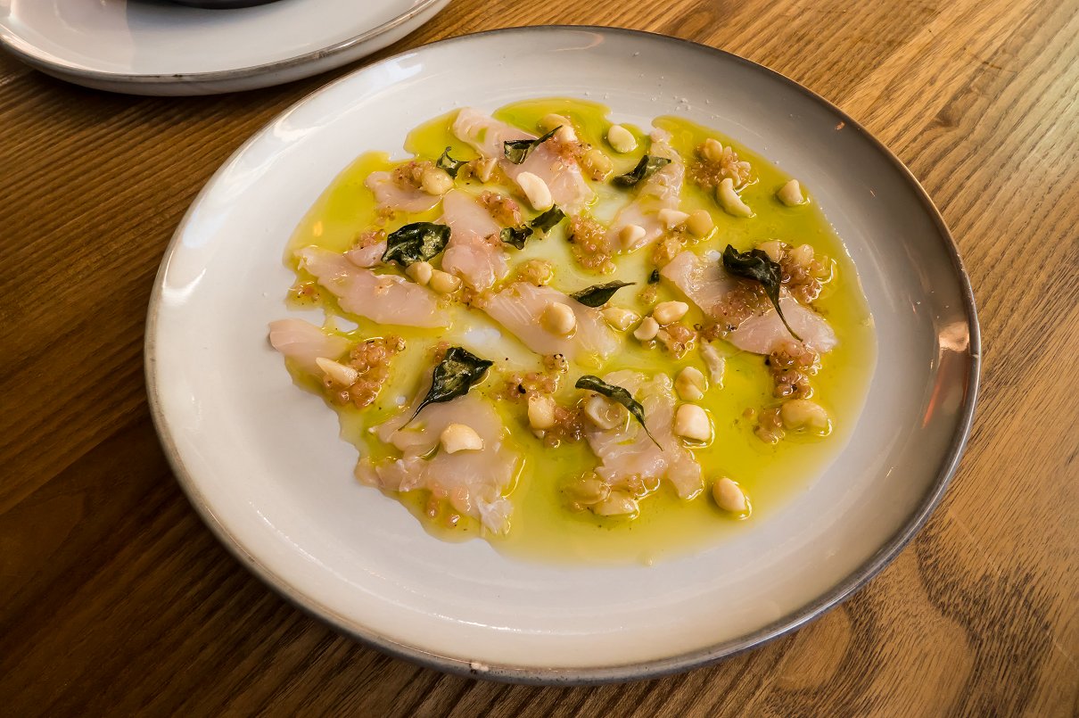 The Market Fish Crudo is thin slices of raw fish atop a bed of lime, macadamia, crisp salt bush and parsley. The crunch of the macadamia, the crispness of the salt bush and the silkiness of the market fish make for a variety of texture that play together on the tongue. The combination of tangy lime, sweet macadamia and salty herbs mingle on the palate and create a gorgeous taste sensation.