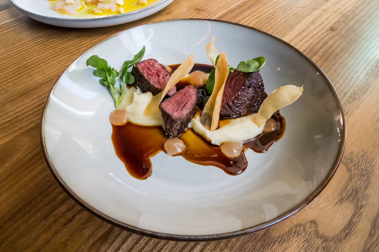 The Kangaroo Fillet is served with pear-cider caramel jus, mushroom pâté and parsnip cream. The kangaroo is cooked perfectly tender. The pear-cider and caramel jus is rich in both colour and flavour, with a tart sweetness that contrasts beautifully with the light flavours of the parsnip cream. When paired, all the flavours mingle perfectly to enhance the richness of the tender kangaroo meat and create a delicious and decadent dish.