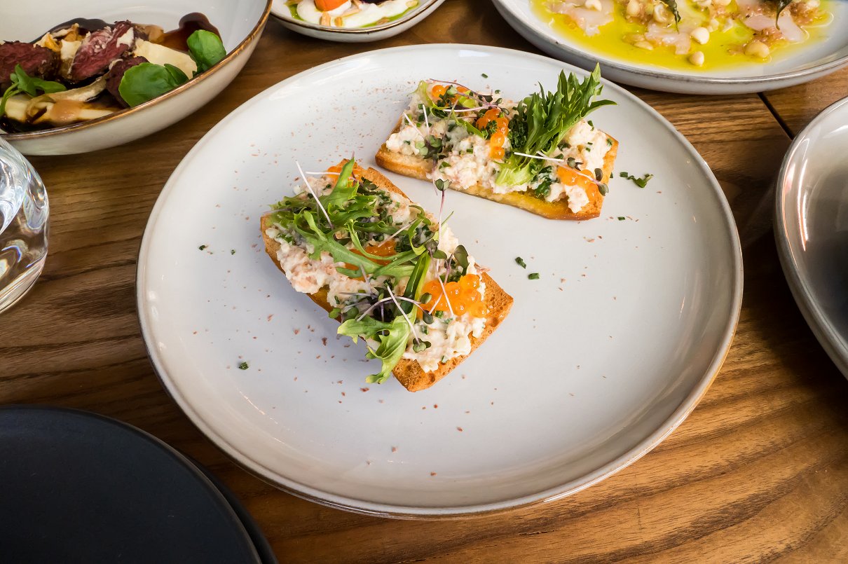 The Blue Swimmer Crab Costini has blue swimmer crab, creme friache, chives, bottarga and salmon pearls on top of thin slices toasted, crusty bread. The crab has strong flavours and a rich, creamy texture which pairs well with the crispness of the toasted bread. The salmon pearls add a salty taste to the dish and explore with flavour in your mouth whenever you take a bite.