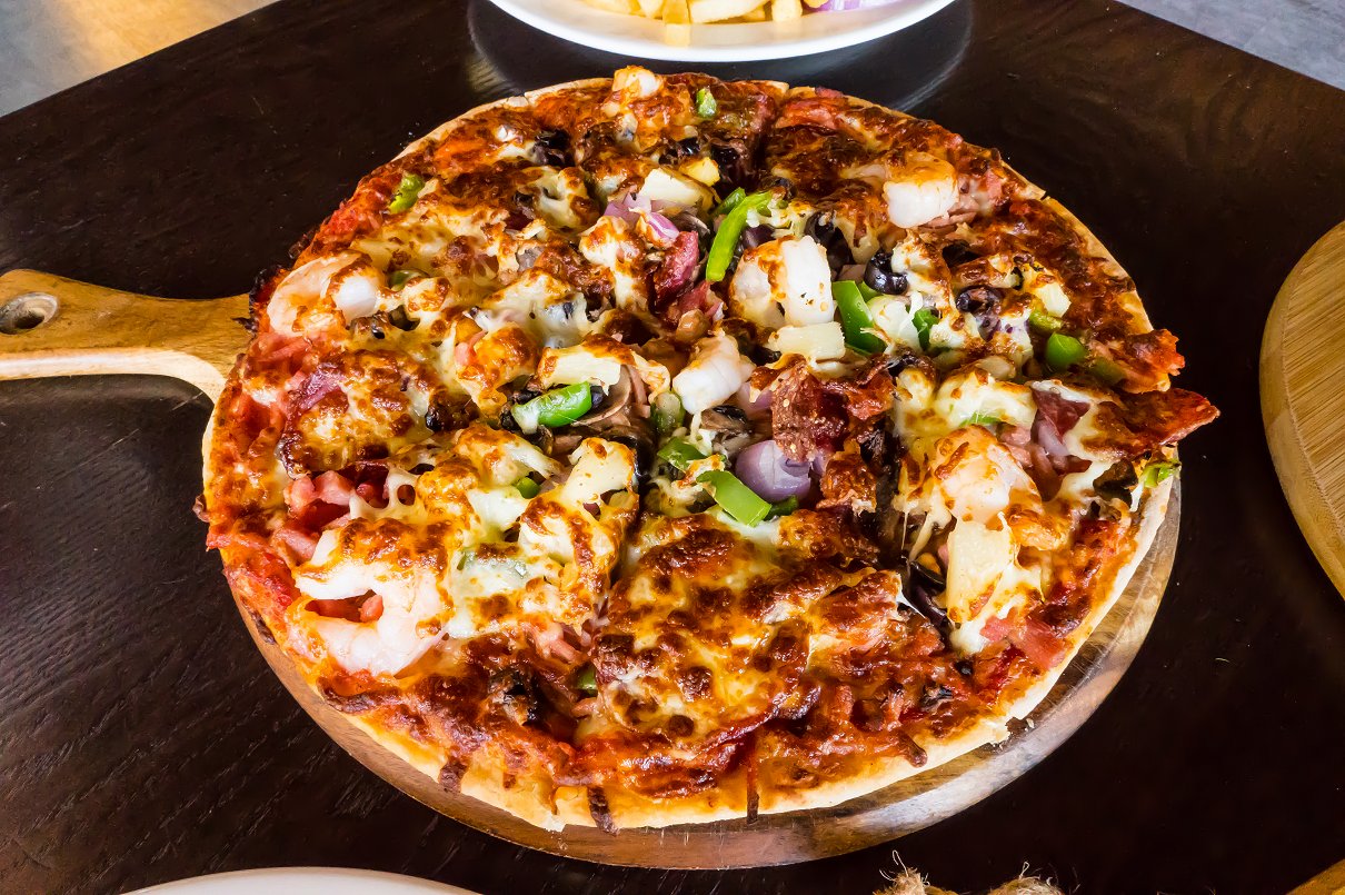 The pizzas range from the classics, such as Meat Lovers, Margarita and BBQ Chicken to the Chef Specials of The Garden, Mamma’s Pizza and (of course) Chief pizza. As I’m sure you’re well aware, we love our food and the more the merrier! Hence, our elected pizza was The Works; ham, mushrooms, spicy pepperoni, capsicum, onion, crunchy bacon, pineapple, olives, anchovies (I decided to remove this particular element from my slice), prawns all covered in oodles of cheese!