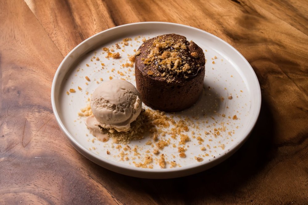 Straight out of the oven, consuming this dessert is like a hug for the soul. Velvet, chocolatey lava oozes from the cocoa fondant, its smoothness contrasted with crunches from the praline crumb, and the cool, nutty ice-cream providing a contrasting reprieve from the warm chocolatey cocoa. A perfect dish.