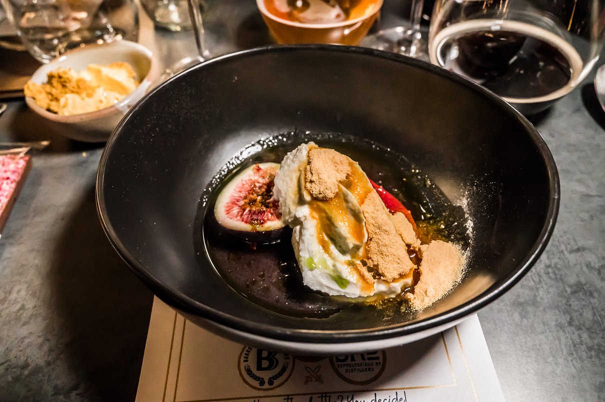 Lastly we had Buffalo Curd Creme with honeycomb and pickled figs from Woodside Cheese Wrights. Unlike anything I’ve ever had, this sharp and tangy cheese was sweetened by the delightful honeycomb crumb. An unlikely but perfect pairing! In a tough final battle, Stout won over Savoury Allsorts Gin for this dish pairing.