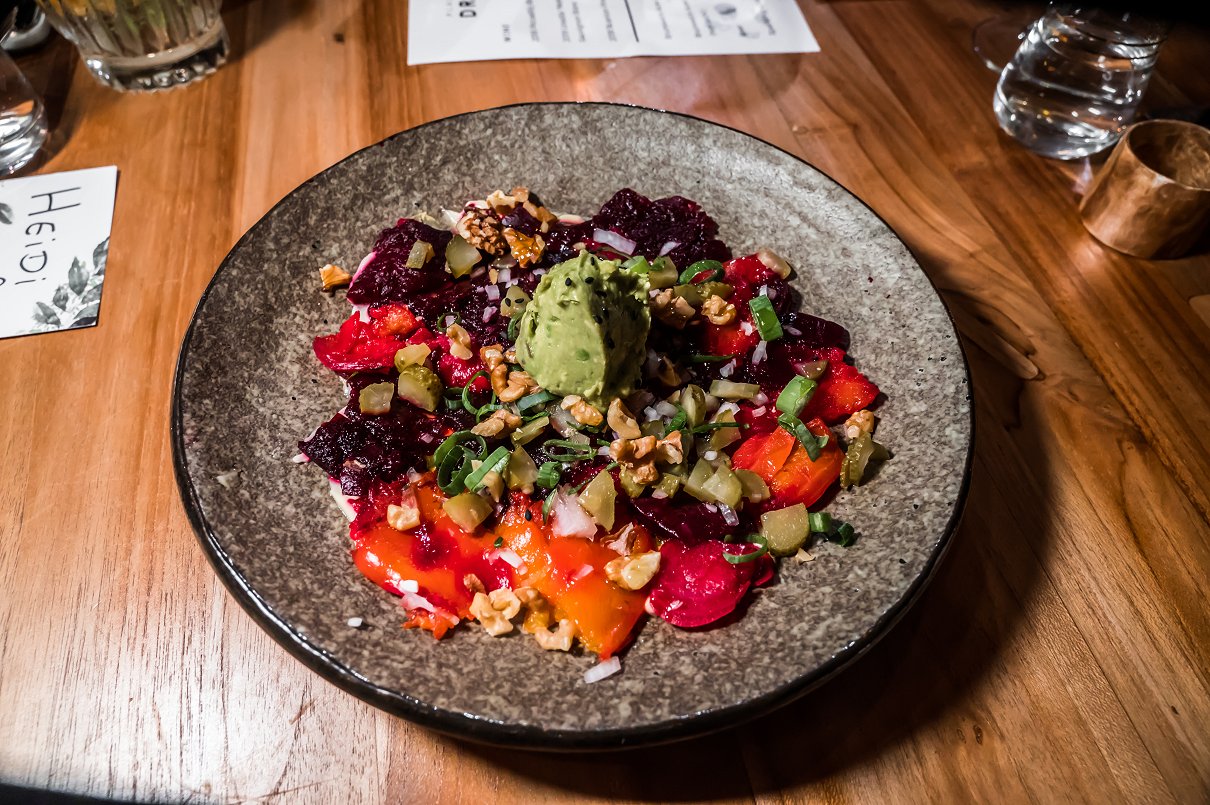For entrée we had a fun take on beef carpaccio – instead we had beet carpaccio inspired the island of Sardinia, Italy. The roasted and flattened beetroot was topped with gherkin, spring onions, walnuts and avocado. The tang of the tasty toppings counteracted the sweetness of the beetroot, but for me the crunch of the walnuts made the dish even better.