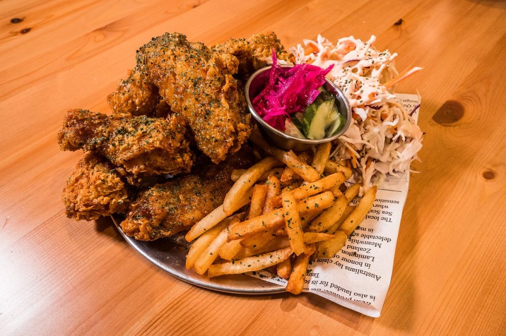 Served with a side of ultra-thin fries, freshly prepared coleslaw and brightly pickled vegetables that add a burst of piquancy to each bite, this is one helluva KFC.