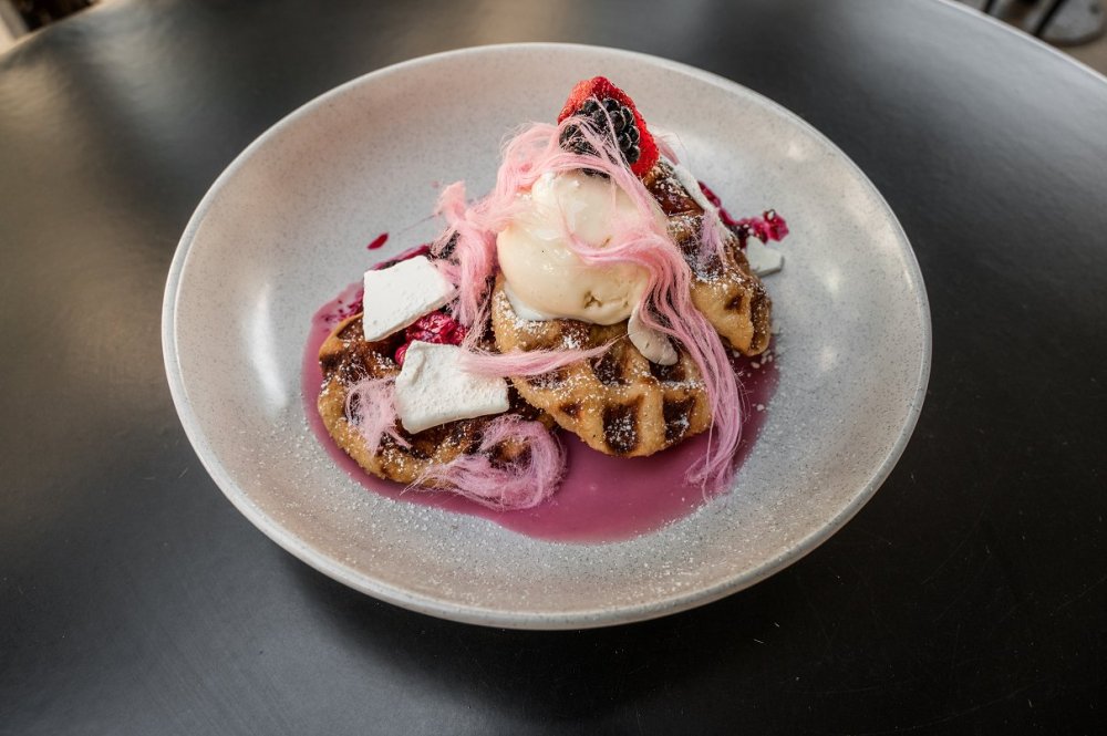 Life is short – eat dessert first! A perfect option for those with a sweet tooth, this colourful creation is a pastel dream. Artistically decorated with strands of pale pink fairy floss, a forest of berries, shards of meringue that delicately dissolve on the tongue, and drizzled with an icing-like curd and deep red coulis, these waffles are the definition of a guilty pleasure.