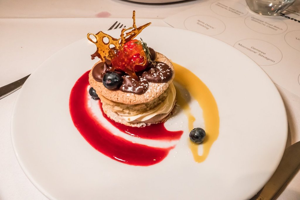 To end the night, we had the Chocolate Marquis layered Chocolate Mousse with Spiced Rum-Soaked Sponge, Honey Chocolate Glaze and served with Fresh Berries and Hazelnut Lace. A beautiful way to end the night. The combination of chocolate mousse and sponge was rich and decadent, and topped off with the natural sweetness of the berries. This was paired with the Gemtree ‘Ernest Allan’ Shiraz which had the aroman of blackberry, cinammon, cherry liqueur and creamy oak. On the palate, you could taste mulberry and red berry fruits.