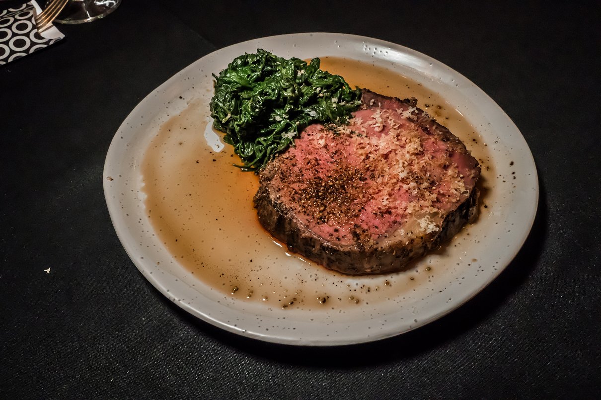 Simplicity, executed perfectly. Beside a mound of darkly green, decadently creamed spinach, lay a generous fillet of blushing pink rib eye, exuding umami flavours only possible in beef of this calibre.