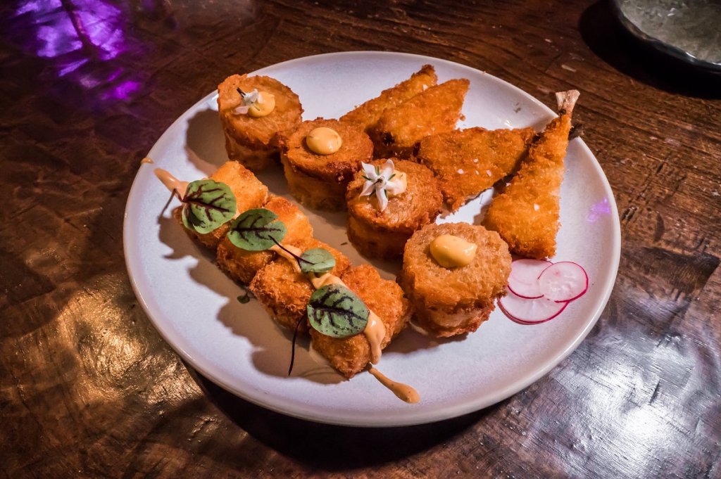 Fried Mac & Cheese, Prawn Flower Sando, Crumbed Aji Fish