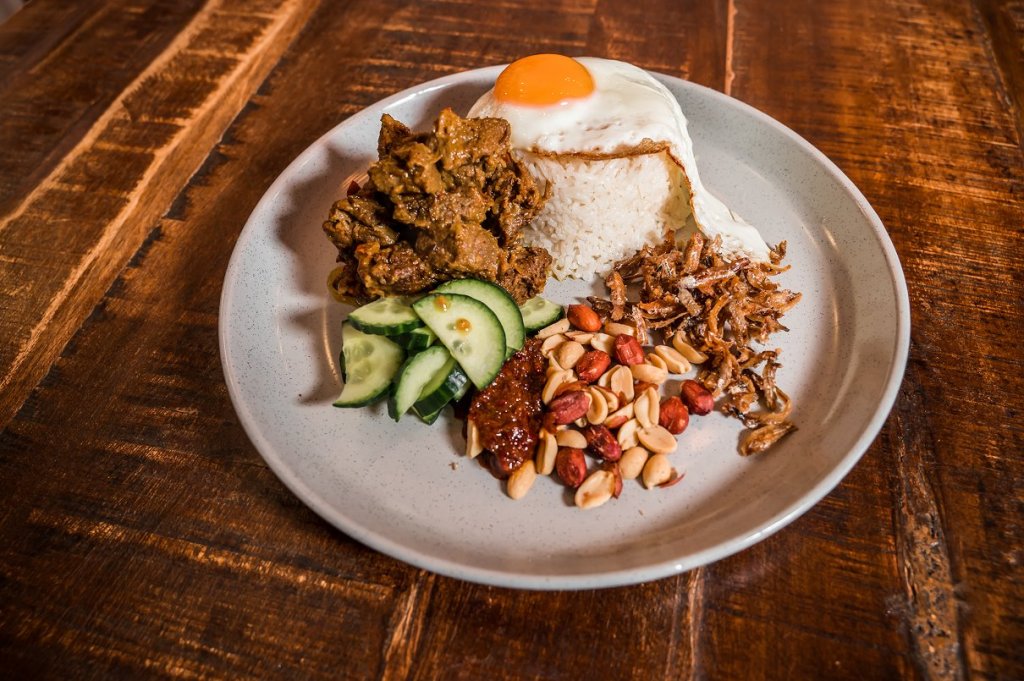 Nasi Lemak served with coconut rice, anchovies, roasted peanuts, sambal, fried egg and beef rendang