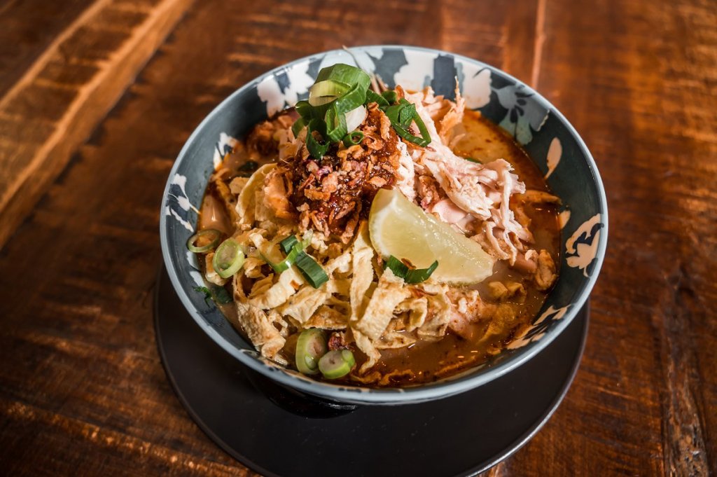 Sarawak Laksa served with vermicelli noodles, bean sprouts, shredded egg and sambal with roasted chicken