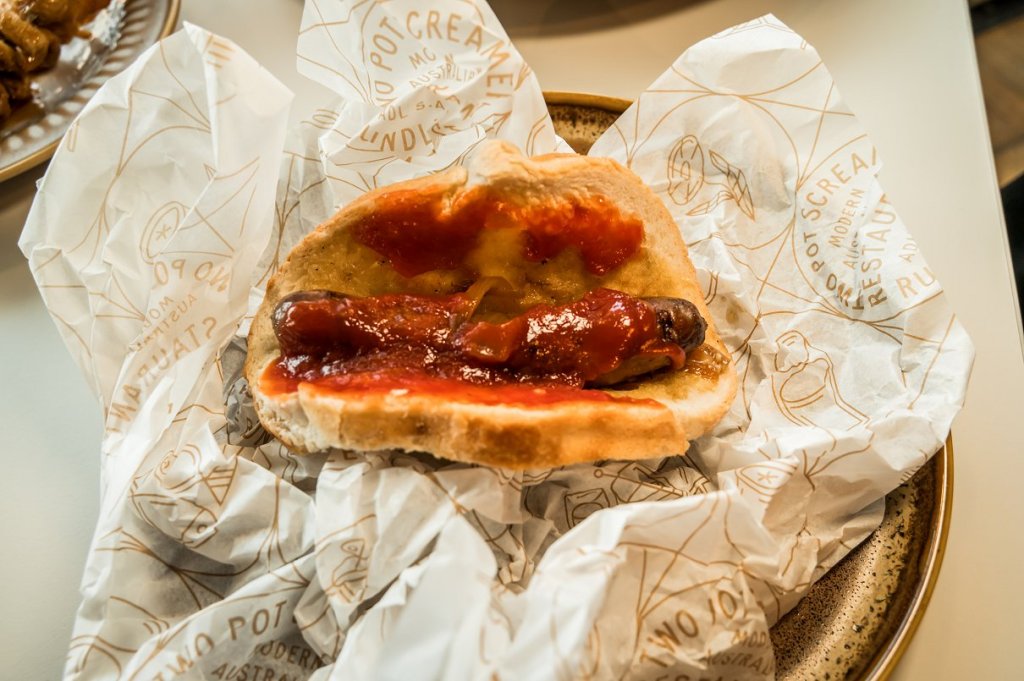 This was pretty much your typical Bunnings snag, a funny thing to see in a restaurant, but it tasted exactly like you get on your Saturday morning hardware store visit. In a small piece of bread lay a micro Boston Bay sausage topped with onion butter and tomato sauce. It was certainly a snack to make your stomach happy.
