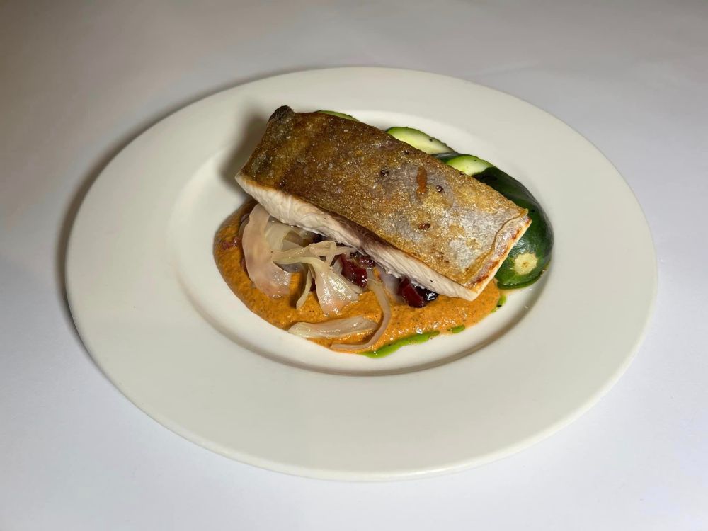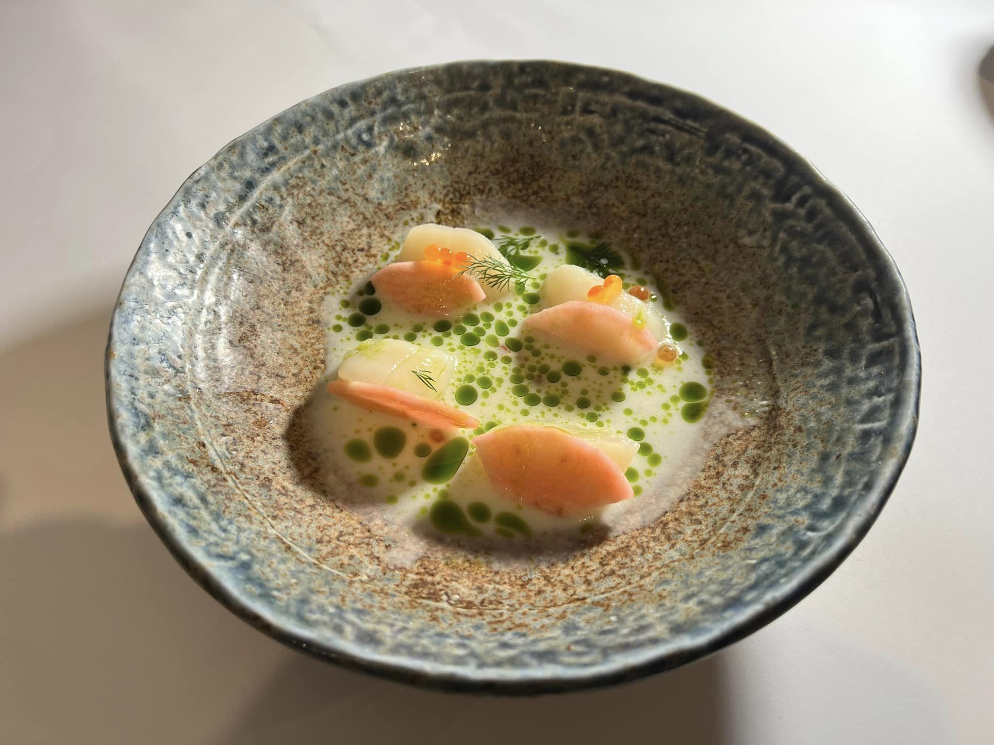 We started the night with Scallops Crudo with buttermilk, pickled apple and bay leaf oil. You could taste the freshness of thin scallop slices. The combination of buttermilk oil, pickled apple and bay leaf oil created the perfect dressing for the freshly caught scallops. This dish was paired with the 2022 The Lane Pinot Gris. The wine was clean, crisp and fresh. A classic cool-climate Pinot Gris displaying lifted guava, honeysuckle and crunchy Nashi pear with a waxy texture and lively citrus finish.