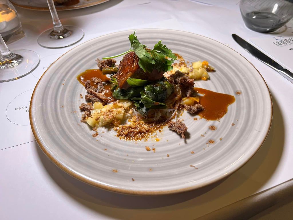 The Crispy Duck Salad with glass noodles, swamp cabbage, glazed pineapple, mandarin, and confit chili was a tantalising exploration of flavours and textures. The succulent duck, perfectly crispy on the outside and tender on the inside, provided a delightful contrast to the lightness of the glass noodles and the freshness of the swamp cabbage and citrusy fruits. The glazed pineapple added a sweet note, while the confit chili infused a subtle heat that lingered pleasantly on the palate. Paired with Pikes ‘Homage’ Cabernet Malbec, the wine’s bold yet refined character elevated the dish, with its notes of dark berries and velvety tannins, creating a harmonious balance of flavours that danced on the taste buds. This dish is a testament to culinary creativity and skill, offering a memorable dining experience that satisfies both the palate and the soul.