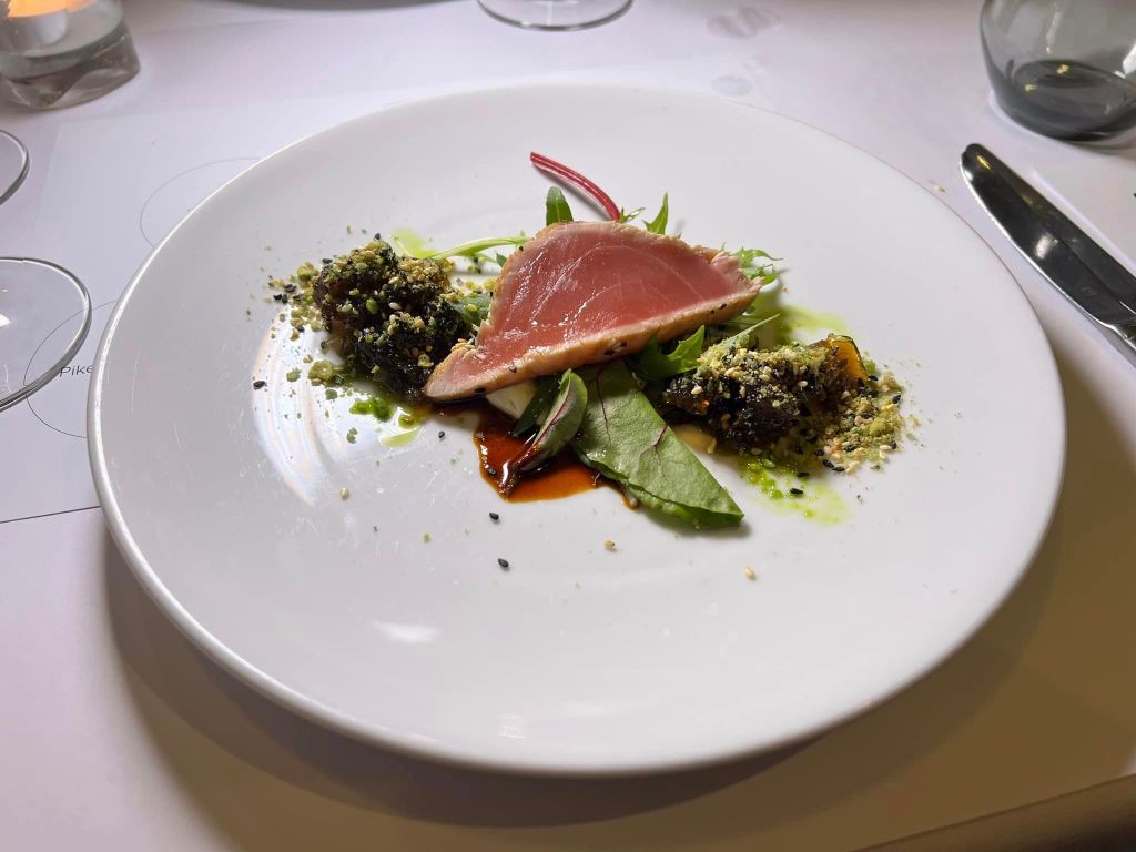 The Yellow Fin Tuna with seaweed jelly, wasabi emulsion, toasted sesame, and black vinegar dressing was a sublime symphony of Japanese-inspired flavors. The delicate yet robust flavour of the tuna was beautifully complemented by the umami richness of the seaweed jelly and the gentle kick of the wasabi emulsion. The toasted sesame added a nutty depth, while the black vinegar dressing provided a tangy contrast that elevated the dish to new heights. Paired with Pikes Luccio Fiano, the wine’s crisp acidity and vibrant citrus notes danced harmoniously with the dish, enhancing its complexity and refreshing the palate with each bite. This culinary masterpiece is a testament to the artistry of fusion cuisine, delivering a dining experience that delights the senses and leaves a lasting impression.