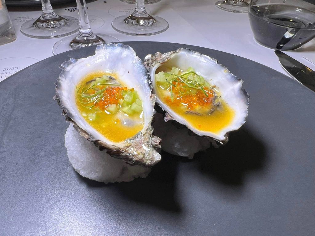The Coffin Bay Oysters adorned with cucumber caviar, Tahitian lime, passionfruit, and flying fish roe presented a captivating symphony of flavours and textures. Each plump oyster burst with freshness, perfectly complemented by the crispness of the cucumber caviar and the zesty brightness of the Tahitian lime and passionfruit. The addition of flying fish roe added a delightful pop of brininess, enhancing the oceanic essence of the dish. Paired with Pikes Traditional Riesling, the wine’s vibrant acidity and floral notes beautifully balanced the richness of the oysters, while its subtle sweetness harmonised effortlessly with the tropical fruit elements, resulting in a refreshing and palate-cleansing experience that celebrated the ocean’s bounty with finesse. This pairing exemplifies culinary artistry at its finest, offering a sensory journey that tantalises the taste buds and leaves a lasting impression.