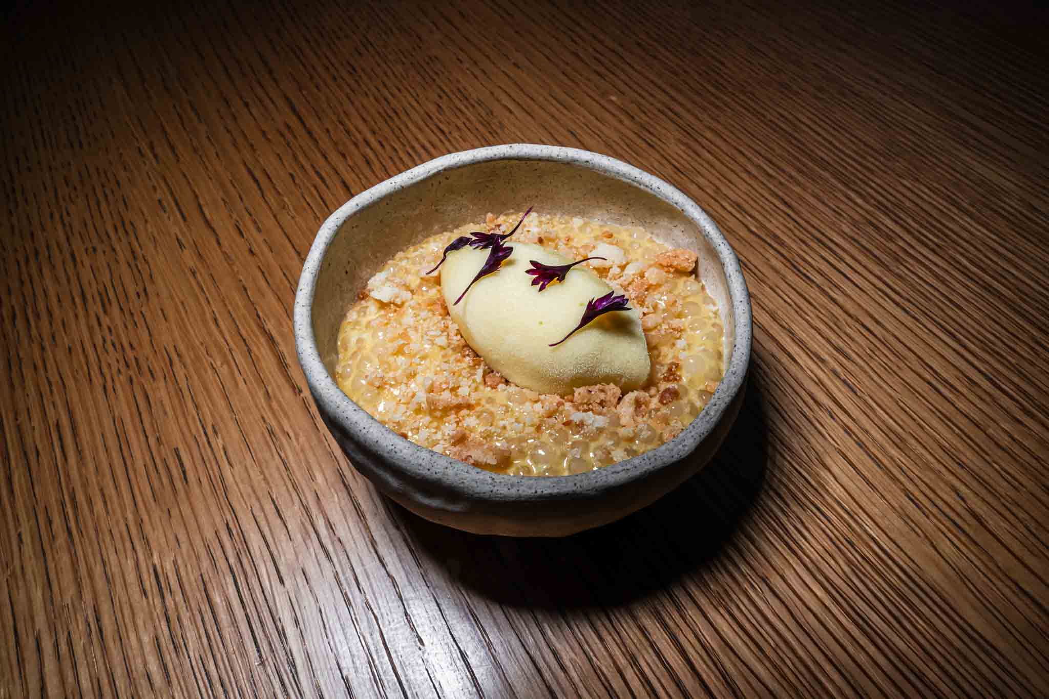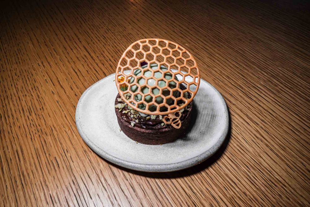 Silky namelaka chocolate filled the tart with deep cocoa richness. Pistachio gelato added nuttiness and freshness, while honeycomb tuile delivered crunch and sweetness. An elegant, indulgent finish.